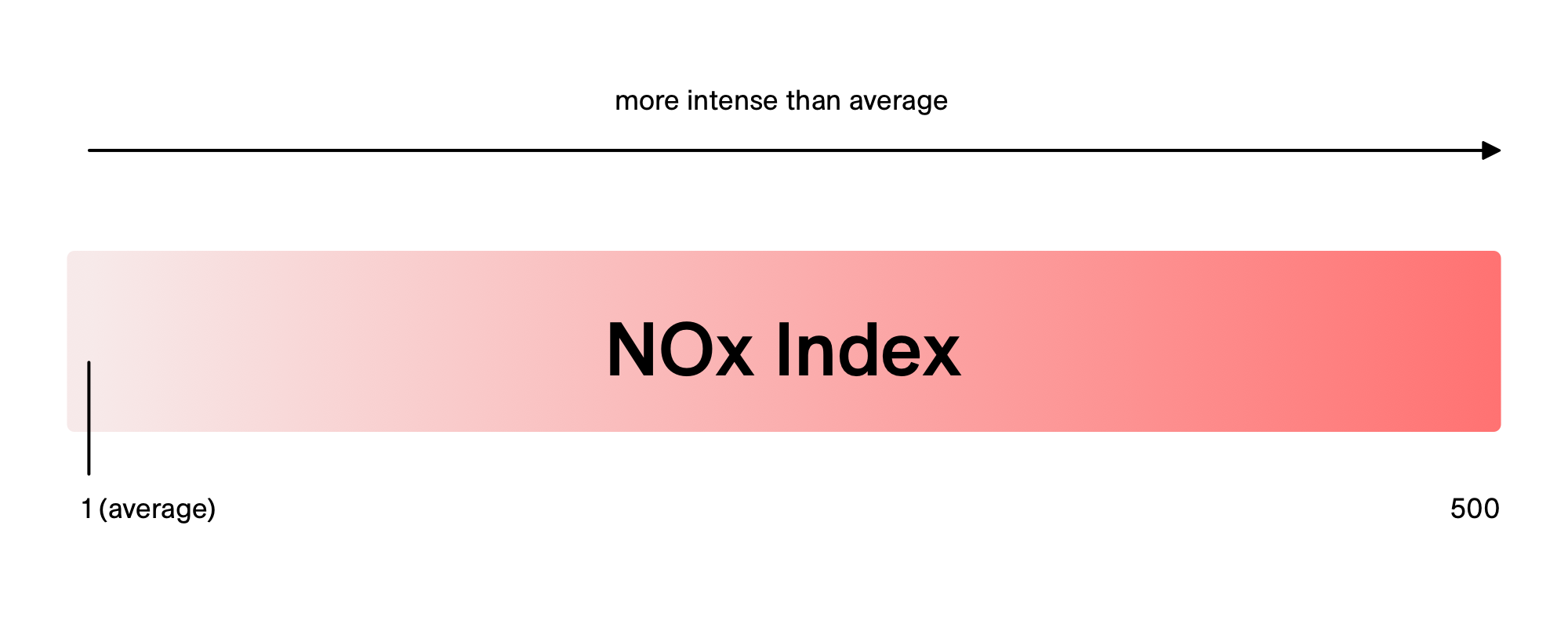 In the Air Lab, NOx is measured by the same SGP41 sensor as VOCs, using a similar relative index. Unlike VOCs where the baseline is 100, the NOx baseline is 1. When nitrogen oxides are detected, values range from 2 to 500.