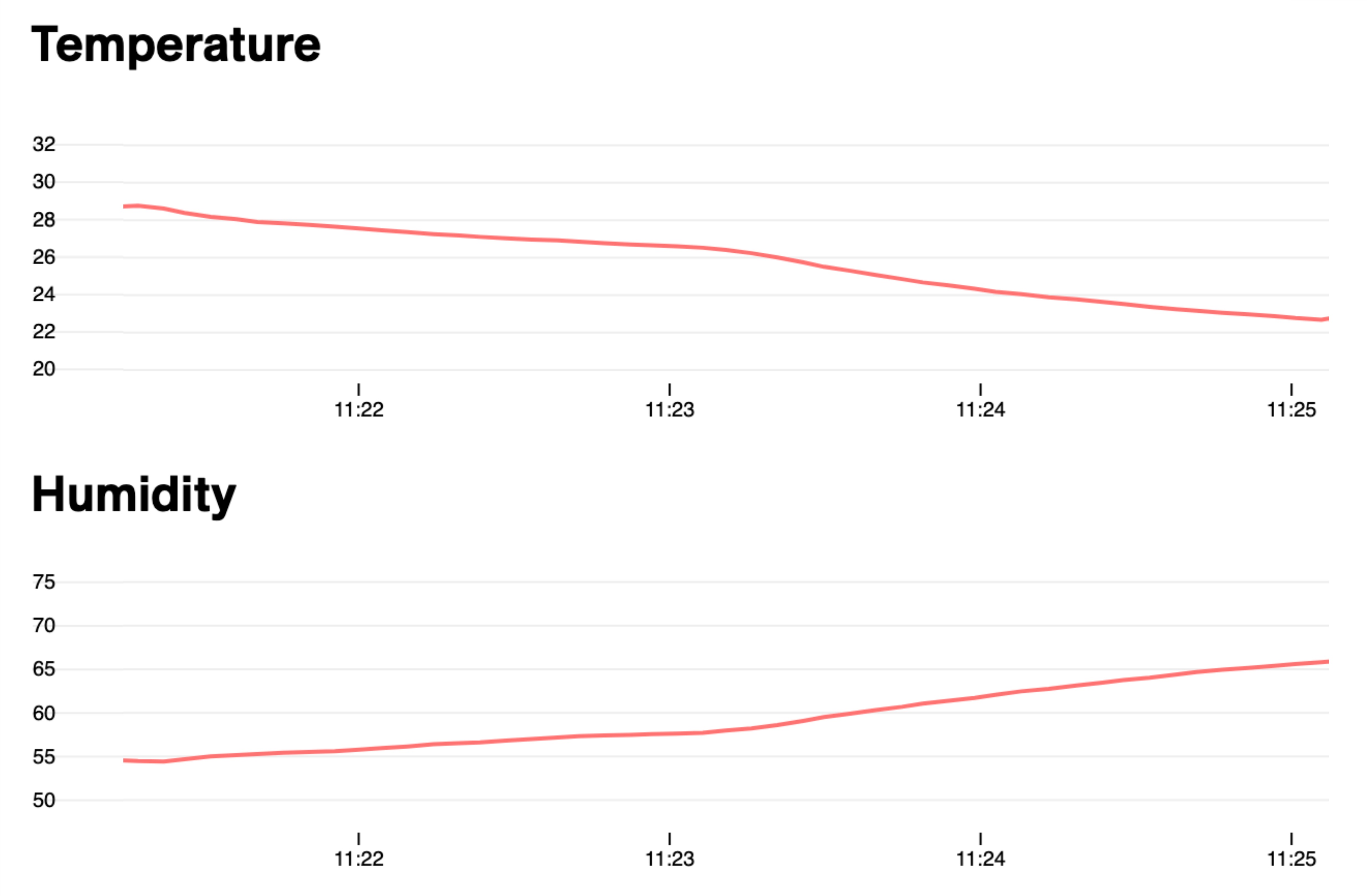 The graphs above show this correlation – as the temperature goes down, relative humidity goes up. This was measured by moving the Air Lab from the sun to the shade, a scenario where only the temperature changes and not the absolute humidity.