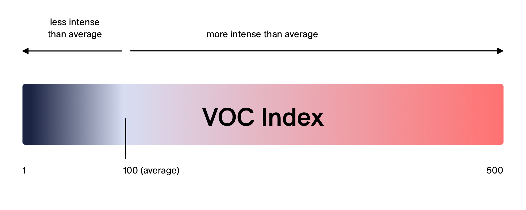 In the Air Lab, VOCs are measured as an index that indicates the relative concentration in the air. The SGP41 sensor reports values in a range of 0–500, where 100 represents the average over the past 24 hours. Values above 100 indicate a higher concentration than usual, while values below 100 indicate a lower concentration.