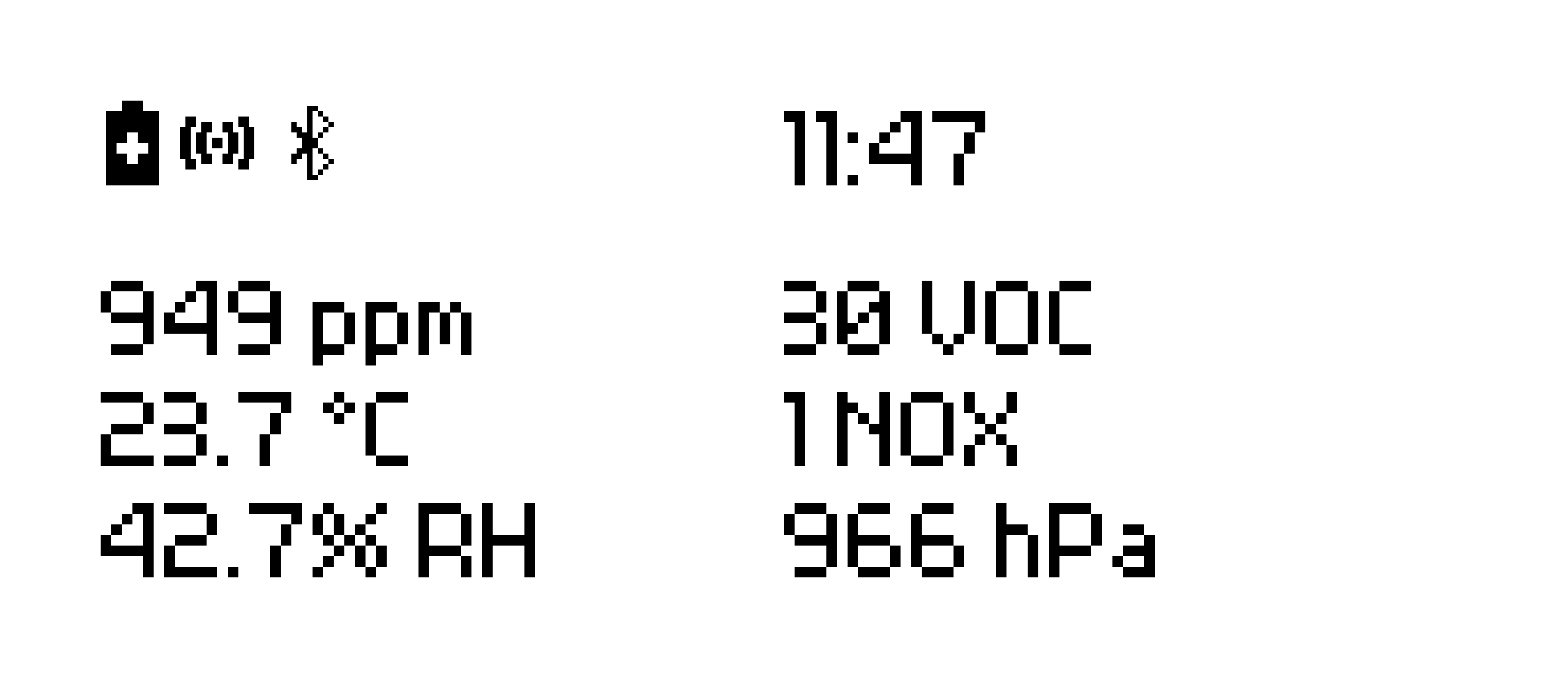 At the top of the screen is the status bar that shows essential information like the current time, followed by an indication of the battery state. If there is an active measurement undergoing, will appear next to it. The icon will indicate an active Bluetooth connection, while will confirm that an MQTT connection has been established. A quick overview of the current air measurement can be viewed in the top right corner of the status bar.