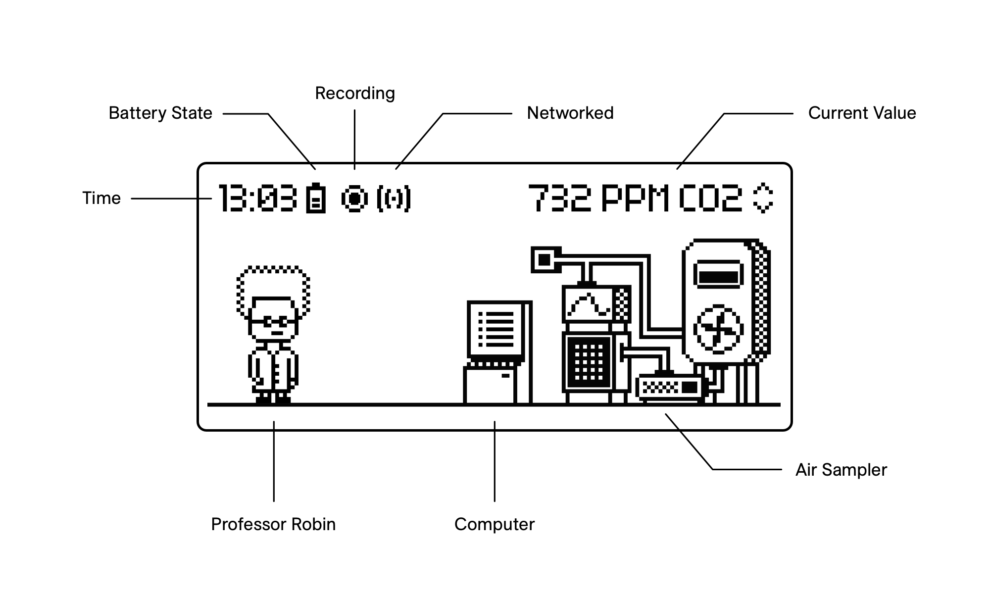 The Lab is your home screen—the central hub from which you access all features and to which you return when exiting menus and programs. Prof. Robin will host you here and comment on the current air quality.