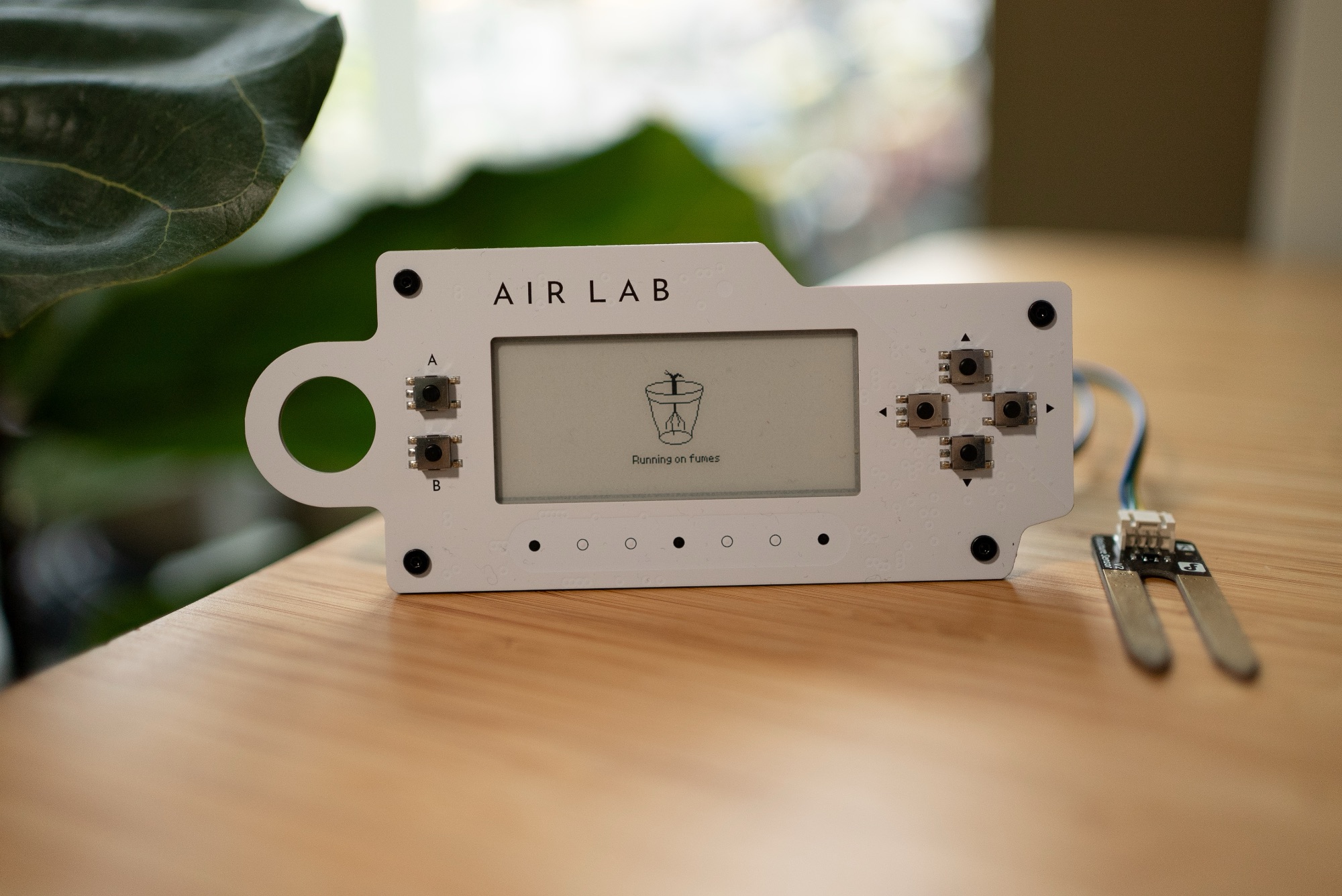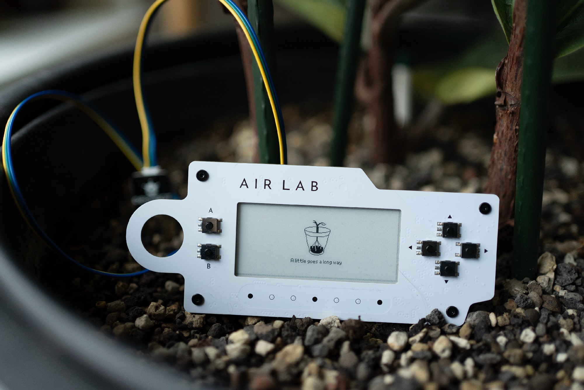 A soil moisture sensor measures how wet the soil is. When placed in a planter, it provides a quick way to determine when a plant needs water. In this project, we will display the soil's saturation level on the Air Lab's E-Paper display.