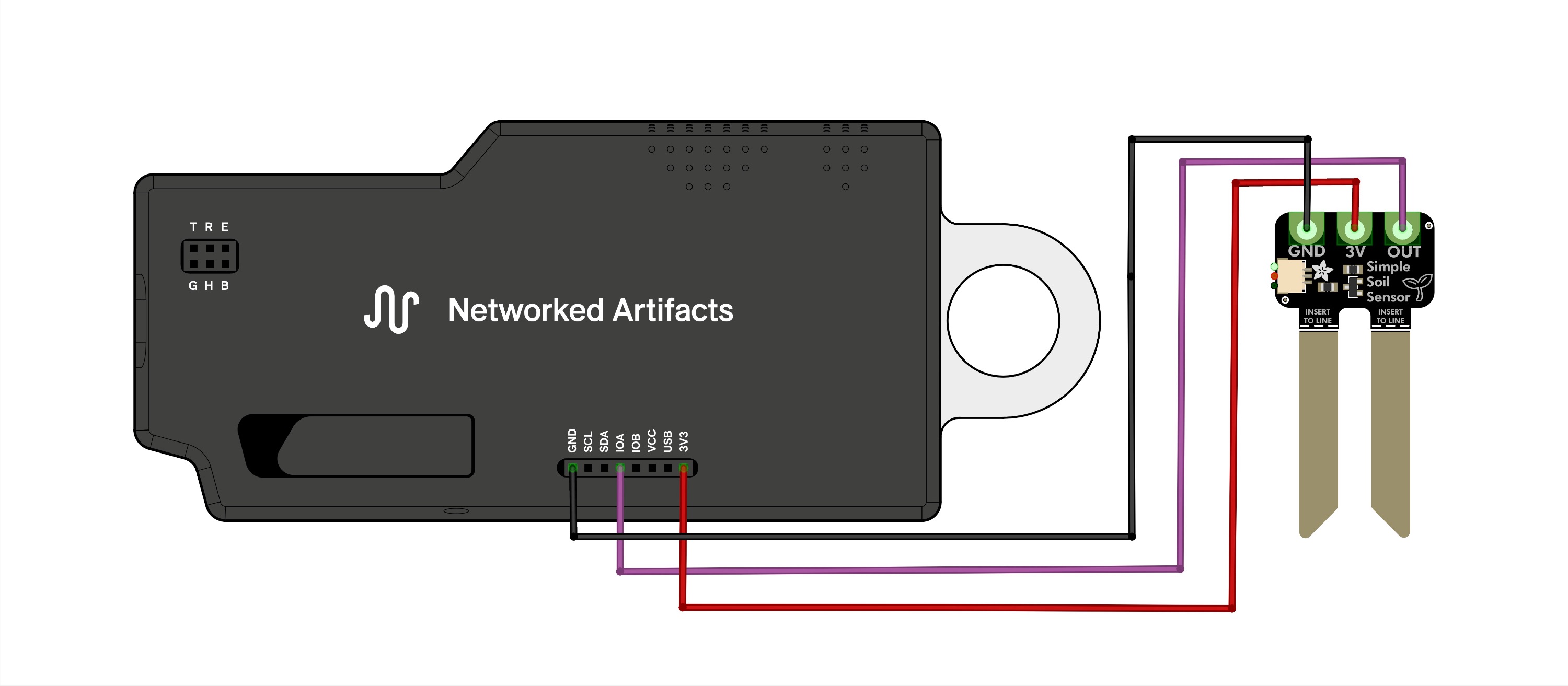 There are several types of soil sensors, each of which uses different technology to measure moisture levels. In this case, we use a resistance method. The sensor's probes pass current through the soil and measure its resistance. The more water present, the more conductive the soil becomes, which lowers the resistance.